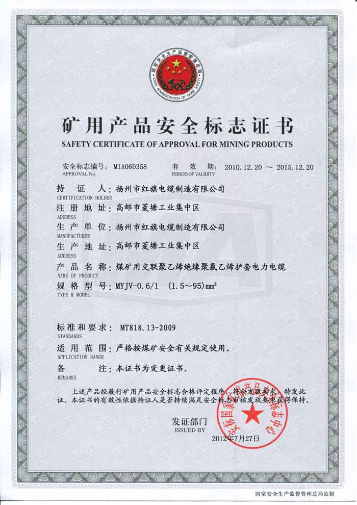 煤礦礦用產(chǎn)品安全標(biāo)志證書(shū)-MYJV