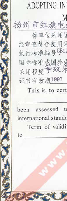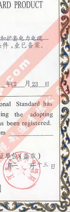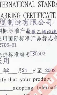 國家技術(shù)監(jiān)督局采用國際標(biāo)準(zhǔn)證書(聚氯乙烯絕緣和護套電力電纜)