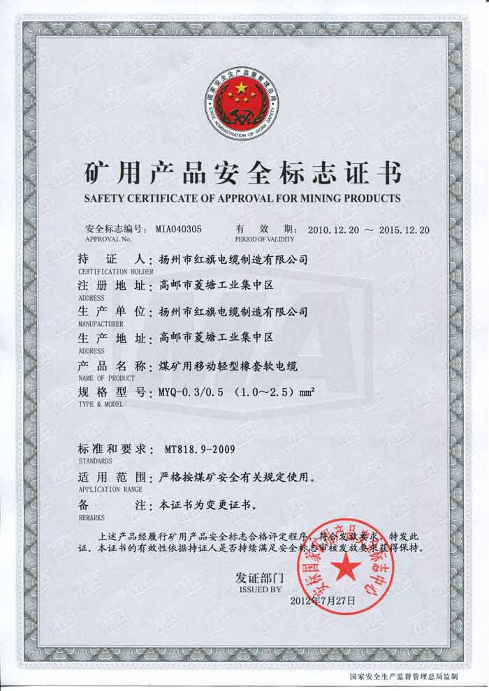 煤礦礦用產(chǎn)品安全標(biāo)志證書-MYQ
