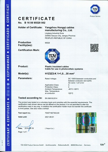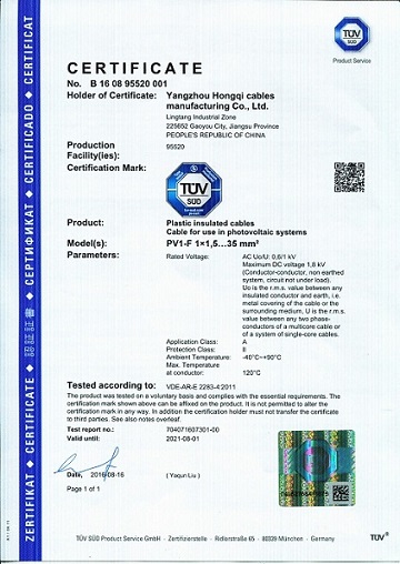 日前,在紅旗全體電纜人的共同努力下,紅旗電纜公司生產(chǎn)的太陽(yáng)能光伏電線電纜成功通過(guò)了德國(guó)萊茵(簡(jiǎn)稱TUV)認(rèn)證,本次認(rèn)證覆蓋了歐盟EN50618:2014和德國(guó)VDE-AR-E2283-4:2011兩個(gè)標(biāo)準(zhǔn)的光伏電線電纜,電線從1×1.5m㎡到1*35m㎡的全部規(guī)格、電纜從2×1.5m㎡到2*6m㎡的全部規(guī)格。
